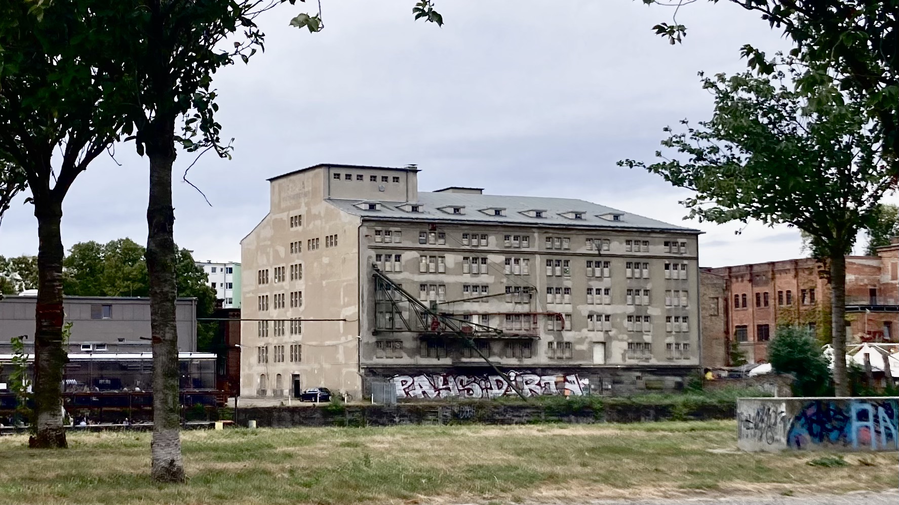 Der letzte Abschnitt der hinteren, blau eingezeichneten Mauer (unten) ist weltweit als „East-Side-Gallery“ bekannt. Ihre 1990 entstandenen Bilder wurden 2009 denkmalgerecht saniert.“