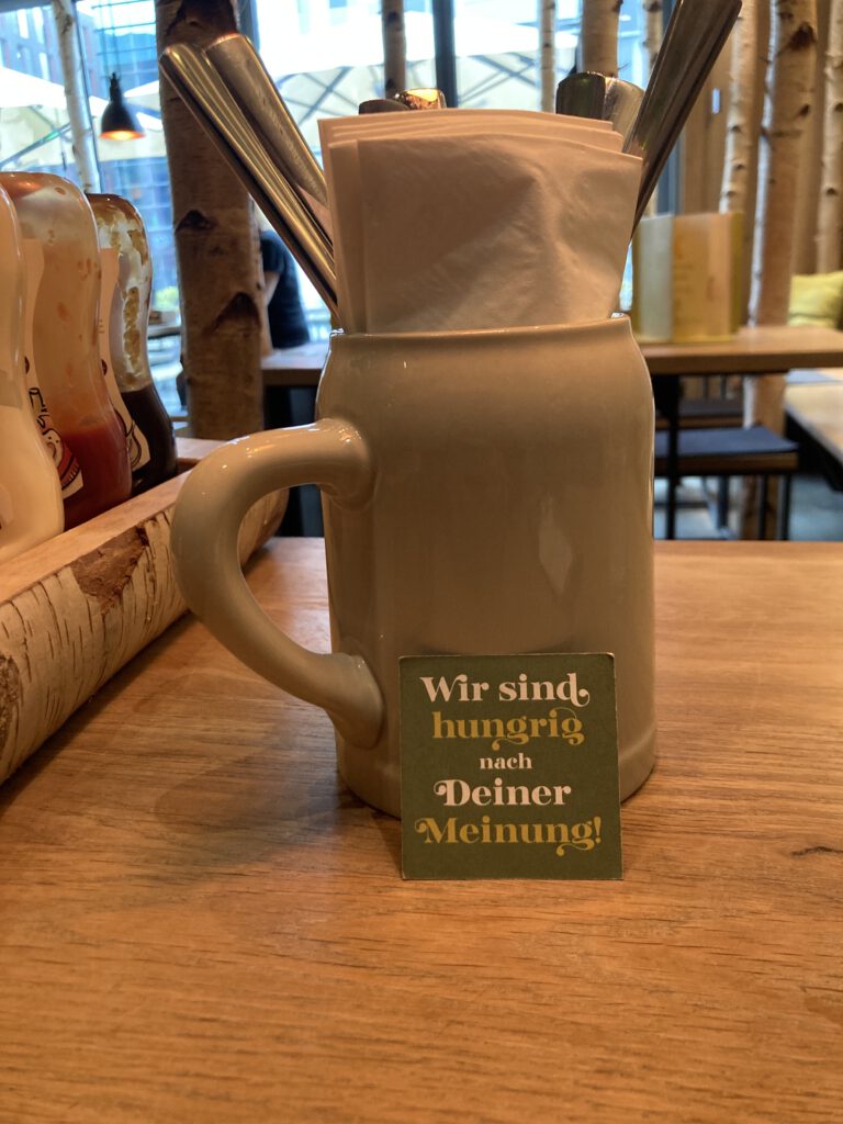 Weiter geht’s mit der austauschbaren Individualität. So verunsichert über das, was man will, dass überall QR-Codes angebracht sind. Weil ich diese erst übersehe, wird mir ein Kärtchen hinterhergetragen.