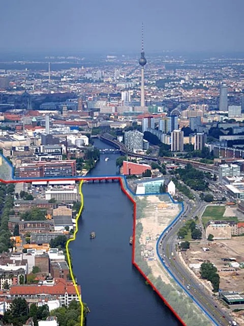 „Der ehemalige Mauerverlauf zwischen Oberbaumbrücke (unten, nicht mehr im Bild) und Schillingbrücke (Bildmitte) an der Grenze zwischen den Ortsteilen Friedrichshain (rechts im Bild, ehemals Ost-Berlin) und Kreuzberg (links im Bild, ehemals West-Berlin).