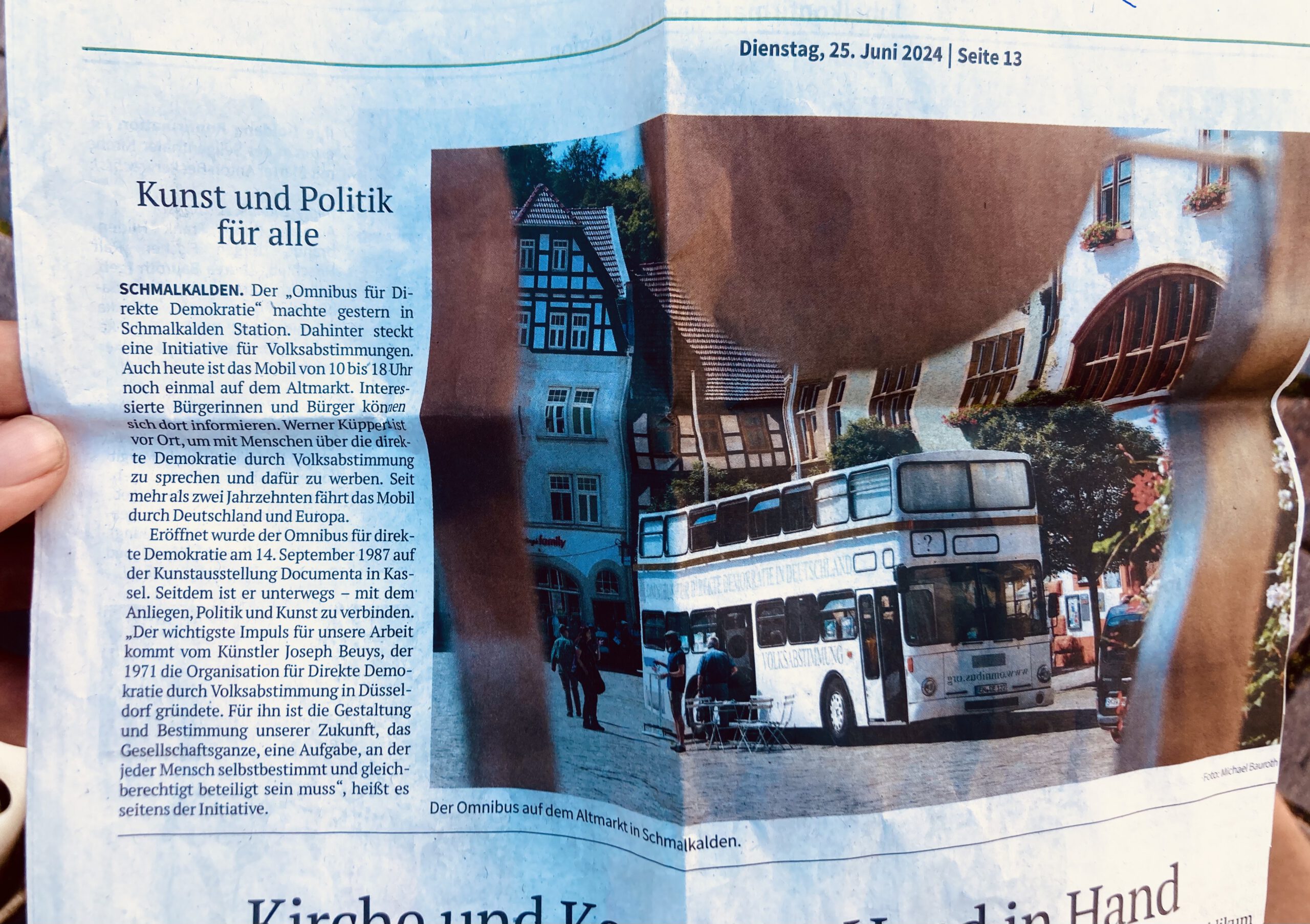 Man hilft uns im Bürgerbüro auf Anfrage mit Stadtplänen, Toiletten und Leitungswasser. Ob sie Information über direkte Beteiligungsmöglichkeiten von Bürgerinnen und Bürgern hätten. Ich werde ins Sekretariat geschickt. Ich komme aus zwei Wochen Urlaub und kann Ihnen nicht helfen. Ich werde ins Hauptamt geschickt. Es ist kurz vor 9:30, sodass ich keine Zeit habe, weil um halb die Gespräch-, Unterschriften- und Fördererfindenarbeit für den Omnibus beginnt.