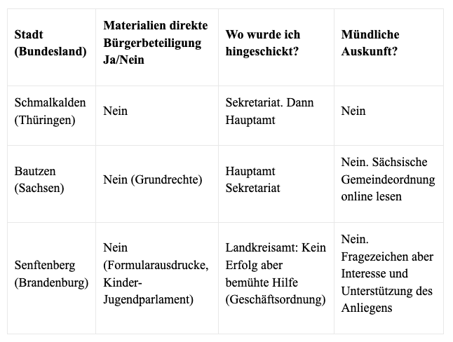 Die gesetzlichen Regelungen zur Volksgesetzgebung auf Bundeslandebene und zum kommunalen und städtischen Bürgerentscheid sind wesentlicher Teil der aktuellen Spielregeln unserer Demokratie. In allen Bundesländern und überall auf kommunaler Ebene ist es mehr oder weniger leicht möglich, sich gemeinsam direkt gesetzgebend einzubringen! Wenn diese Möglichkeiten der direkten Bürgerbeteiligung nicht an den dafür zuständigen Stellen, Rathäuser, Bürgerbüros, Landeszentralen für politische Bildung ausliegen, dann ist das so, als würde man uns beim Fußball nur erklären, wie man Tore schießt, nicht aber was Abseits ist. Kurzgesagt, man sagt uns, ihr könnt Wahlergebnisse erzielen, aber man macht sich keine Mühe, uns aufzuklären, dass wir auch direkt ins Spiel eingreifen können.